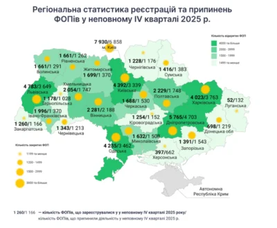Загалом по країні в четвертому кварталі 2025 року було зареєстровано приблизно 58,2 тис. нових ФОП, що на 40% більше, ніж за аналогічний період 2024 року. Водночас кількість припинень діяльності зменшилася до 50,5 тис., що на 18% менше, ніж роком раніше.