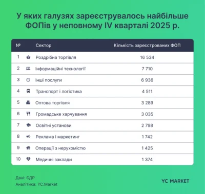 Роздрібна торгівля — близько 16,5 тис. нових ФОП у IV кварталі 2025 року (+42% рік до року);