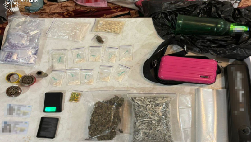 Під час обшуку в помешканні вилучили значну кількість наркотиків: майже 200 г канабісу, псилоцибінові гриби, близько 100 г речовини, схожої на MDMA, майже 50 г PVP, мефедрон, а також близько 90 марок, ймовірно з LSD.
